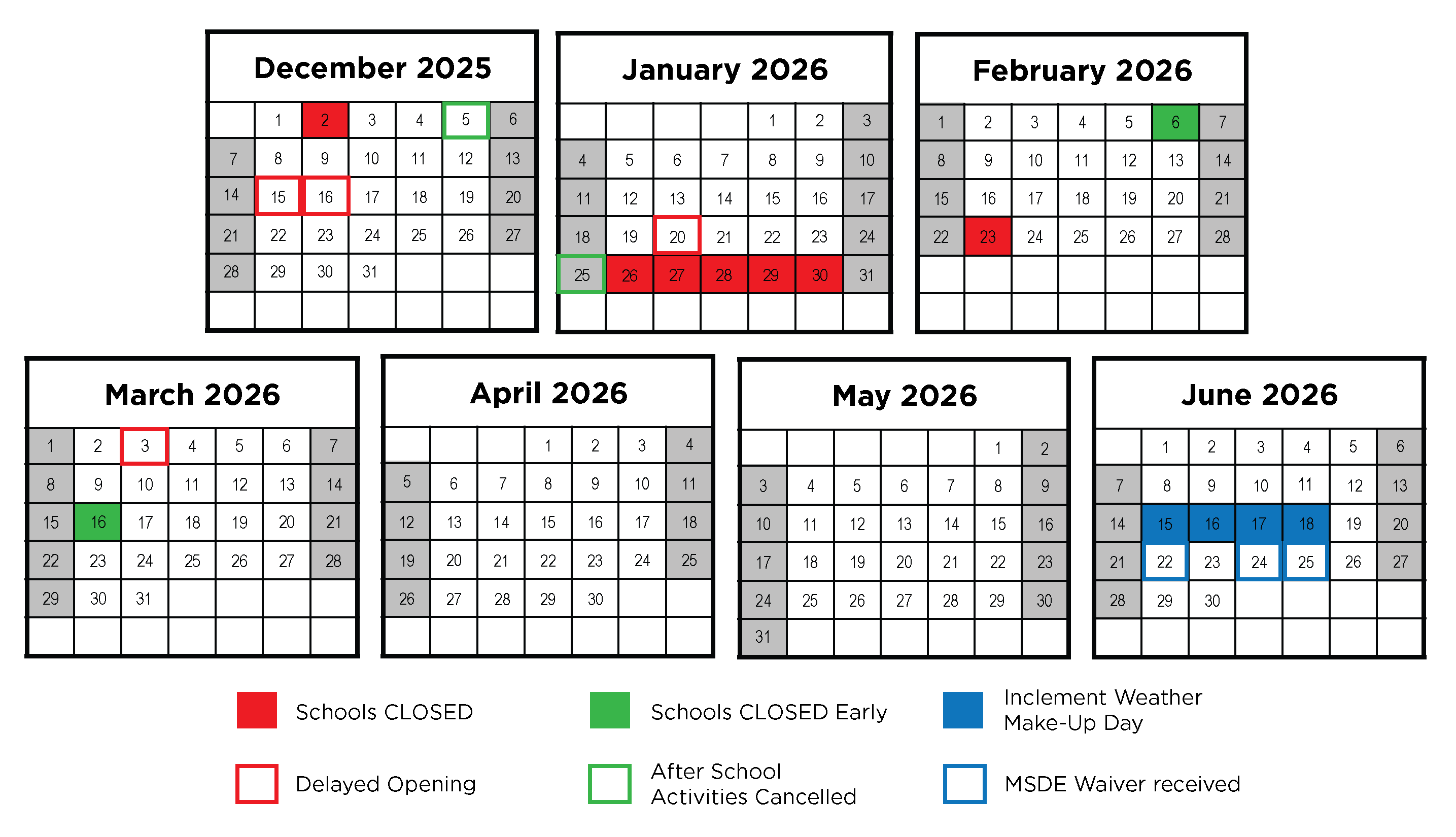 With the approved waiver and these adjustments, if no additional inclement weather closures are needed for the remainder of the year, the last day of school for students will be an early dismissal on Thursday, June 18, 2026.